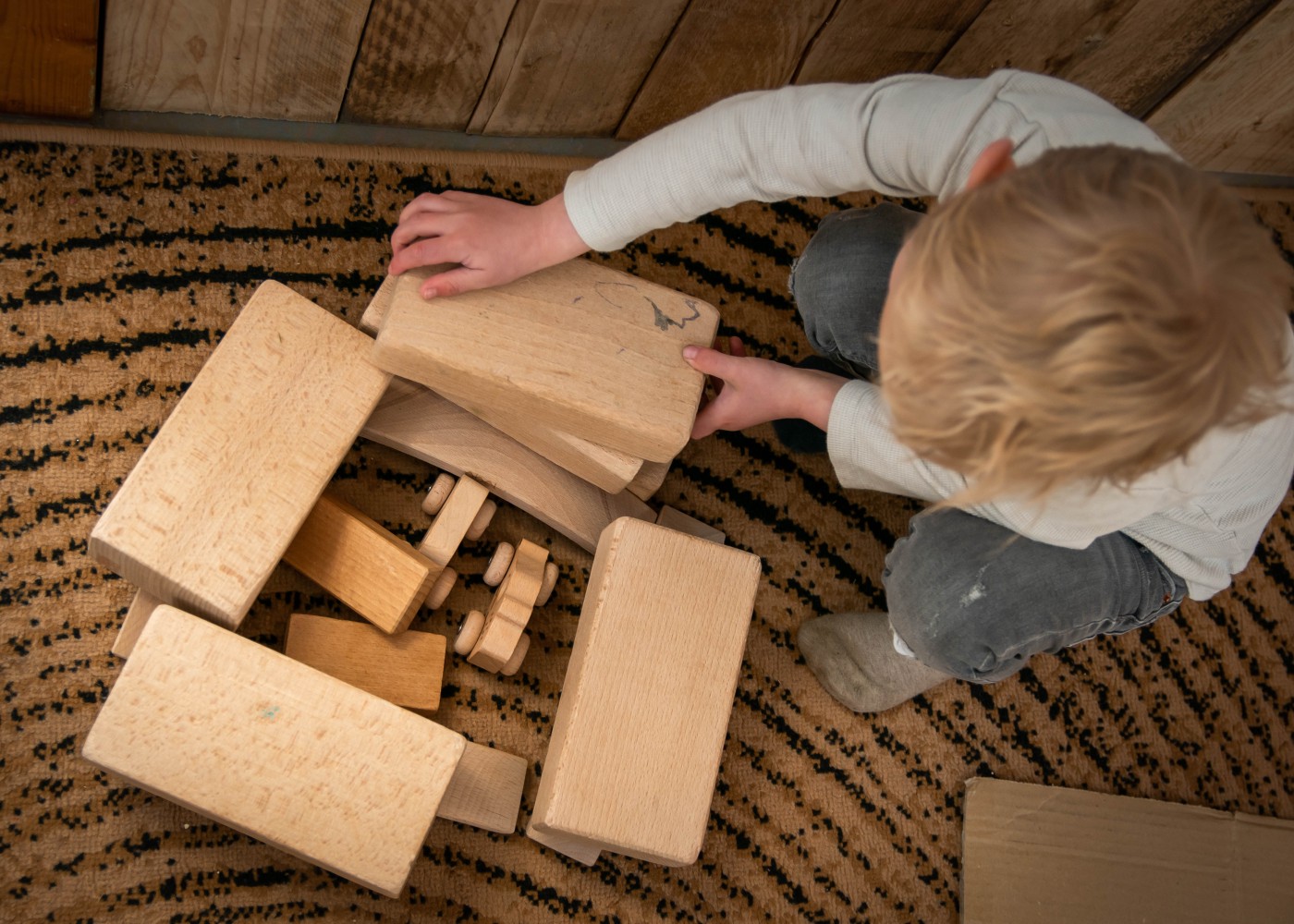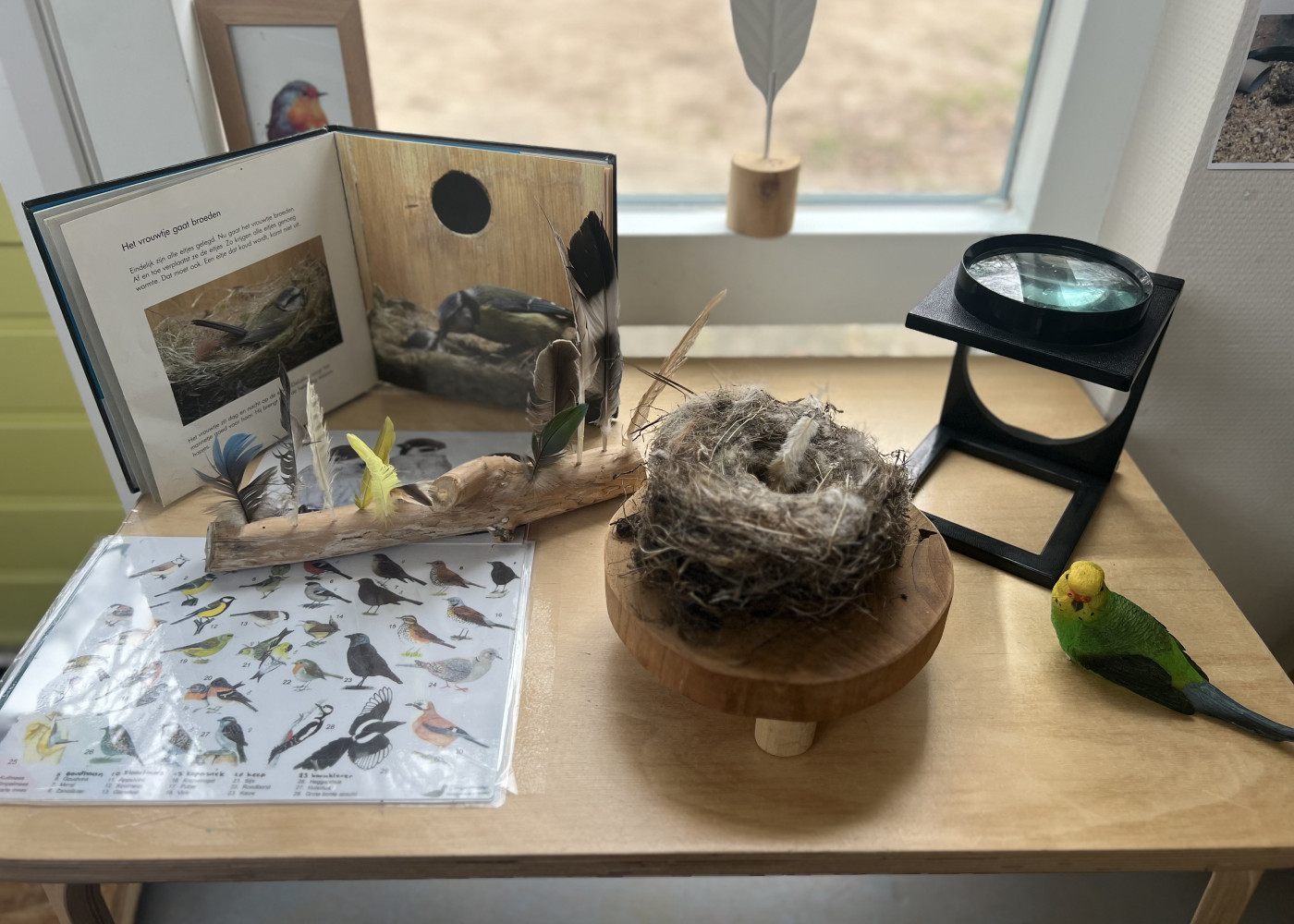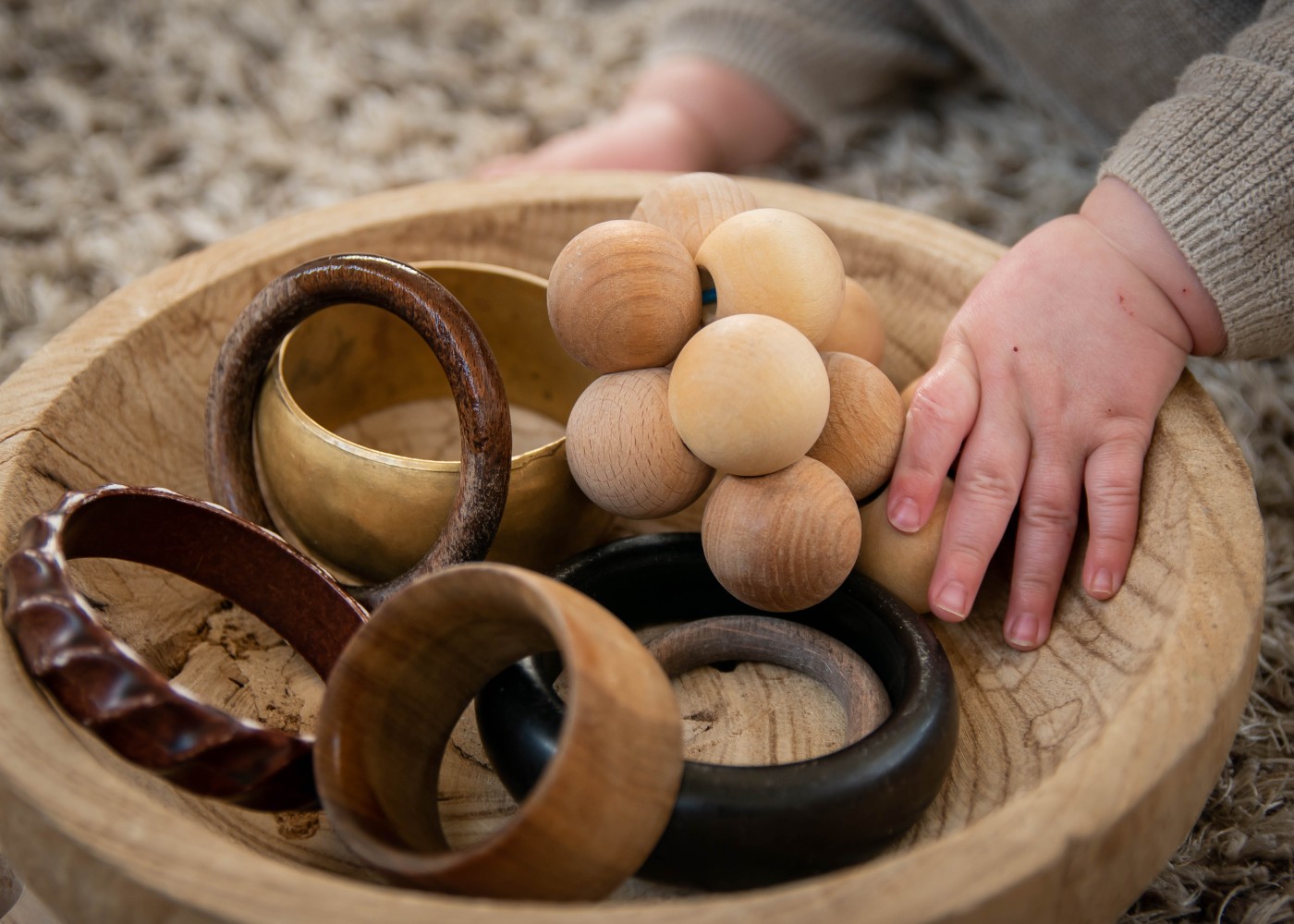 Wij kiezen voor duurzaam en houten speelgoed en materiaal wat alledaags is, bijvoorbeeld een garde of een pollepel. We maken een combinatie van nieuw en hergebruikt spelmateriaal. Er liggen bijvoorbeeld een paar houten blokken, een doek, een kommetje en een houten rammelaar. Maar ook natuurlijke materialen, zoals gras, een dennenappel of bladeren.